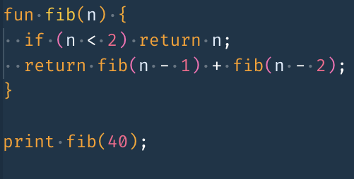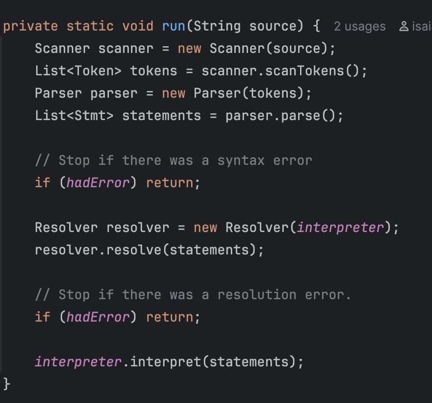 This project is the result of following along with Part 2 of Robert Nystrom's book, "Crafting Interpreters." The book walks through the process of designing and implementing (in Java) a programming language called Lox. I learned about and implemented the following features of programming languages: tokens and lexing, abstract syntax trees, recursive descent parsing, prefix and infix expressions, runtime representation of objects, interpreting code using the Visitor pattern, lexical scope, environment chains for storing variables, control flow, functions with parameters, closures, static variable resolution and error detection, classes, constructors, fields, methods, and inheritance.